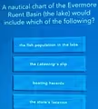 The other options are incorrect for specific reasons. Information on fish populations would be found on a fish finder map or in an ecological survey, not a navigational chart. The location of a store is terrestrial information more suited for a road map or a tourist guide. While a specific feature like “the Catherine’s slip” (a place to dock a boat) might appear on a detailed harbor chart as a landmark, the general category of “boating hazards” is a more universal and critical element for all nautical charts. The chart’s core mission is safety through navigation, making the identification of hazards its most defining characteristic among the choices given.