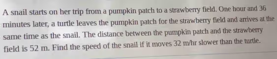 First, let’s define our variables. Let v_s be the speed of the snail and v_t be the speed of the turtle. Let t_s be the time the snail takes and t_t be the time the turtle takes. The units for speed will be meters per hour (m/hr) and for time will be hours (hr).