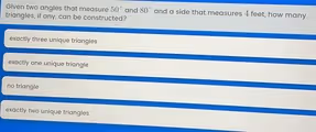 Possibility 1: The 4-foot side is one of the two equal sides. In this case, the two sides opposite the 50° angles are each 4 feet long. The third side, which is opposite the 80° angle, would have a different, specific length. This configuration creates one unique, valid triangle.