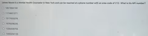 The crucial piece of information to pinpoint the correct individual is the phone number’s area code, 212, which serves as a final filter. A search of the NPI Registry confirms that the NPI number 1679208235 belongs to a James P. Moore. His professional details list him as a Mental Health Counselor with a primary practice address in New York, New York. Most importantly, the contact phone number associated with his practice begins with the 212 area code. The other numerical options provided in the question belong to other healthcare providers in different locations or with different specialties, or they do not match the specific combination of name, profession, and location details required. Therefore, through a systematic process of elimination using the public registry, 1679208235 is verified as the correct NPI number for the James Moore described.