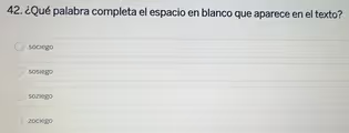 The question presented is “42. ¿Qué palabra completa el espacio en blanco que aparece en el texto?” which translates to “42. What word completes the blank space that appears in the text?”. Although the text itself is not visible, the question is clearly a multiple choice spelling test, asking to identify the correctly written word among four similar-sounding options. The core task is to distinguish the correct Spanish orthography for the word meaning tranquility or calmness.