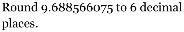 To round the number 9.688566075 to six decimal places, you first need to identify the sixth decimal place and look at the next digit (the seventh decimal place) to determine if rounding is necessary.
