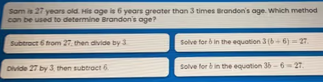 Therefore, the correct sequence of steps to find Brandon’s age is to first subtract 6 from 27 and then divide the result by 3. This matches the chosen answer perfectly. The other options are incorrect because they represent different equations or an incorrect order of operations for solving the problem.