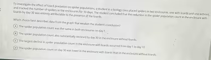 The correct answer is B. The spider population count also substantially declined by day 30 in the enclosure without lizards.