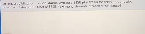 The initial step is to isolate the portion of the total cost that was applied to the students. We can achieve this by subtracting the fixed building rental fee from the total amount Ava paid. The calculation would be the total payment of $325 minus the $120 rental fee. This leaves us with $205. This $205 represents the total amount of money paid specifically for the students who attended the dance, separate from the cost of the venue itself.