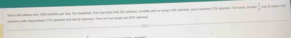 Tom’s diet allows only 1300 calories per day.