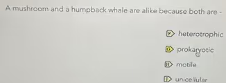 The other options are incorrect. Both mushrooms and whales are eukaryotic, not prokaryotic, meaning their cells have a true nucleus. While a whale is motile (capable of movement), a mushroom is sessile (fixed in place). Lastly, both are large, complex multicellular organisms, not unicellular. Thus, their shared method of acquiring nutrition as heterotrophs is the correct likeness.