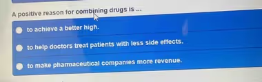 While making revenue is a goal for pharmaceutical companies and achieving a high is a motivation for recreational use, neither represents a positive medical reason for combining drugs. The true clinical advantage lies in creating a more potent and safer treatment regimen for the patient.
