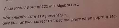 To find Alicia’s score as a percentage, we need to follow a few key steps. The problem states she scored 8 out of a possible 121. We are asked to convert this score into a percentage and round it to one decimal place.