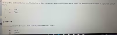 Focal vision is the correct term to complete the sentence. This type of vision is the highly detailed, sharp, and clear view at the very center of your visual field. It covers a very small area, typically about three to five degrees, and is what you use when you consciously look directly at an object to identify it with precision. For example, when driving, you use your focal vision to read a street sign, check your speedometer, or identify a specific hazard like debris on the road ahead. The question’s phrasing, “the vision that helps a person see direct objects,” perfectly describes this function of focusing on and recognizing specific items.