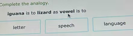 1. letter: A vowel (like a, e, i, o, or u) is a specific type of letter. The alphabet is composed of two main categories of letters: vowels and consonants. So, “letter” is the general category that contains vowels. This perfectly mirrors the relationship between “iguana” and “lizard.”