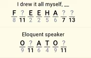 With this key, you can now approach the first puzzle. The clue is the sentence, “I drew it all myself, ___”. The puzzle below it is F ? E E H A ? ? over the numbers 8 11 2 2 5 6 7 13.