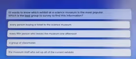 The other options are flawed for several reasons. Surveying “every person buying a ticket” is ineffective because these people have not yet seen the exhibits and therefore cannot have a favorite. Their responses would be based on expectation, not experience. Surveying “a group of classmates” would result in a heavily biased sample. This small, homogenous group would not reflect the diverse ages, backgrounds, and interests of the general museum-going public. Their preferences would not be representative of the whole. Finally, asking “the museum staff who set up all of the current exhibits” would also yield poor data. While the staff is knowledgeable, their perspective is that of a creator, not a visitor. Their opinions on which exhibit is “best” might be influenced by factors like the technical difficulty of the installation, rather than the entertainment or educational value experienced by the public. Therefore, to determine visitor popularity, one must survey the visitors themselves using an unbiased method.