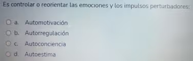 The other options represent different, though related, psychological concepts. Autoconciencia (self-awareness) is the ability to recognize and understand your own emotions and how they affect your thoughts and behavior. It is the foundation upon which self-regulation is built; you must first be aware of an emotion to be able to manage it. Automotivación (self-motivation) is the drive to achieve goals, to take initiative, and to persevere in the face of setbacks. While it may involve harnessing emotions for a productive purpose, its primary focus is on drive and persistence. Lastly, autoestima (self-esteem) refers to an individual’s overall sense of self-worth and personal value. While healthy self-esteem can influence one’s ability to regulate emotions, it is not the act of regulation itself. Therefore, autorregulación is the most precise answer.