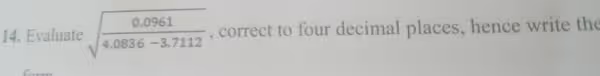 Evaluate sqrt(frac 0.0961)4.0836-3.7112 , correct to four decimal places
