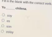 The verb ser is used to describe essential, permanent, or long term characteristics. This includes aspects of identity like nationality, profession, physical descriptions, personality traits, and origin. In the sentence “Yo ___ chilena,” the word “chilena” (Chilean) describes the speaker’s nationality. Since nationality is a core part of a person’s identity and does not typically change, the verb ser is required. The sentence has the subject “Yo” (I), and the correct first person singular conjugation of “ser” is soy.