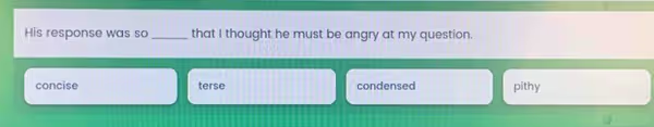 Let’s analyze why the other options are less suitable. “Concise” means being brief but comprehensive and clear. It is generally a positive or neutral quality, suggesting efficiency rather than anger. A concise answer is helpful, not upsetting. “Condensed” typically refers to something, like a text or a liquid, that has been made shorter or more concentrated. It is an awkward and unnatural choice for describing a spoken response and lacks any emotional implication. Finally, “pithy” describes a statement that is brief yet full of meaning and substance, often in a clever or witty way. A pithy remark is usually admired for its intelligence, which is contrary to a response that would be interpreted as a sign of anger.