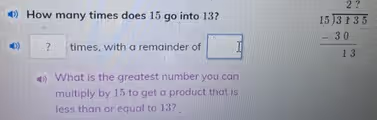 Based on the image, the question is: “How many times does 15 go into 13?” This is a division problem where 13 is the dividend (the number being divided) and 15 is the divisor (the number you are dividing by).