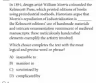 The correct choice, “manifest in,” means to be shown, demonstrated, or made clear. This fits perfectly. The sentence argues that Morris’s rejection of industrialization was made clear or was demonstrated by the Kelmscott editions’ specific features. The text provides evidence for this immediately after the blank. It points to “handmade materials and intricate ornamentation reminiscent of medieval manuscripts.” These handcrafted qualities are the physical evidence, or manifestation, of his anti-industrial principles. The books themselves are the proof of his philosophy.