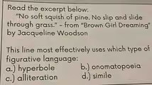 This excerpt from Jacqueline Woodson’s “Brown Girl Dreaming” most effectively uses onomatopoeia to create a vivid sensory experience for the reader. Onomatopoeia is a type of figurative language where a word’s pronunciation imitates its sound. The standout example in this line is the word “squish.” When you read or say “squish,” the word itself mimics the wet, compressing sound one would hear when stepping on damp pine needles. This single word instantly transports the reader into a specific auditory and tactile moment, making the description feel authentic and immersive. By using onomatopoeia, Woodson does not simply tell us about a sound; she allows us to hear it in our minds.