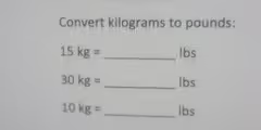 The task presented in the image is to convert measurements of mass from kilograms (kg) to pounds (lbs). Kilograms are a standard unit of mass in the metric system, used globally in science and in most countries for everyday measurements. Pounds are a unit of mass primarily used in the imperial and United States customary systems. To perform this conversion accurately, one must use the correct conversion factor.
