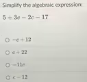 To simplify the algebraic expression 5 + 3c – 2c – 17, you need to identify and combine the “like terms.” Like terms are the parts of the expression that have the same variable raised to the same power. In this problem, we have two types of terms: constant terms (the numbers) and terms with the variable ‘c’.