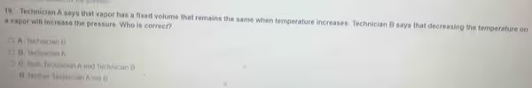 Technician A’s statement is incorrect because it misrepresents the fundamental properties of a vapor, which is the gaseous state of a substance. A key characteristic of gases is that they do not have a fixed volume or a fixed shape. The molecules in a gas are spread far apart and move randomly, allowing the gas to expand and fill the entire volume of any container it is placed in. While it is possible to hold a vapor within a rigid container of a fixed volume, the vapor itself does not inherently possess a fixed volume that remains constant regardless of conditions. For instance, if the container were flexible like a balloon, increasing the temperature would cause the gas to expand, thus increasing its volume. Technician A’s assertion that vapor has a fixed volume is fundamentally flawed.