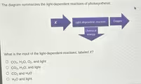 The provided diagram illustrates the inputs and outputs of the light-dependent reactions, which are the first stage of photosynthesis. To determine the correct inputs labeled X, we must understand the role of this stage. The primary purpose of the light-dependent reactions is to capture energy from sunlight and convert it into chemical energy, which will be used in the second stage of photosynthesis.