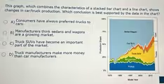 This graph, which combines the characteristics of a stacked bar chart and a line chart, shows changes in car/truck production.