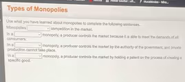 Based on the provided image, here are the correct answers to complete the sentences about the types of monopolies.