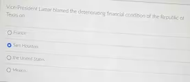Vice-President Lamar blamed the deteriorating financial condition of the Republic of Texas on France Sam Houston the United States Mexico