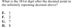 The image provided for the question is incomplete, as it refers to an “infinitely repeating decimal above” that is not shown. However, this is a classic type of mathematical problem, and the context strongly suggests that the missing decimal is the expansion of the fraction 1/7. The decimal representation of 1/7 is 0.142857142857…, where the sequence of six digits “142857” repeats infinitely. The answer choices provided are consistent with the digits found in this particular sequence.