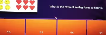 The correct answer, therefore, is 6:4, which simplifies to 3:2. This provides a clear, simplified relationship between the smiley faces and hearts.
