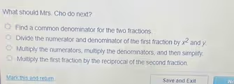 This question tests the knowledge of the correct procedure for performing arithmetic operations on fractions, specifically algebraic fractions. Although we cannot see the original problem Mrs. Cho is working on, the options provided describe the key steps for different operations. The most logical conclusion is that she is faced with a division problem involving two fractions.