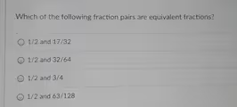 The other options are incorrect. For the first pair, 17/32 is not equivalent to 1/2 because half of 32 is 16, not 17. For the third pair, 1/2 and 3/4 are different values; 1/2 is equal to 0.5, while 3/4 is 0.75. For the last pair, 63/128 is very close to 1/2, but not exact, as half of 128 is 64.
