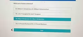 The third option, which is highlighted in the image as a user’s selection, shows “Mr. Miles V. Brinckerhoen” and “Mr. Miles V. Brinkerhoen.” This is a classic trick option. The names are almost the same, but a very subtle difference exists in the spelling of the last name. The first name includes the letters “ck” (“Brinckerhoen”), while the second omits the “c” (“Brinkerhoen”). This pair is therefore incorrect.