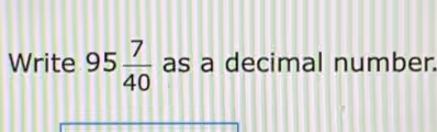 Thus, the mixed number 95 7/40 written as a decimal number is 95.175.