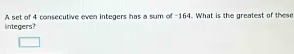 The set of integers is -44, -42, -40, and -38. As a final check, their sum is -44 + (-42) + (-40) + (-38) = -164. The calculation is correct. The greatest integer in this set is -38.