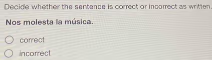 The sentence “Nos molesta la música” is grammatically correct as written. It translates to “The music bothers us” or “We are bothered by the music.” This sentence structure, which is common with verbs like molestar (to bother), gustar (to like), and encantar (to love), can sometimes be confusing for learners of Spanish because the grammatical roles are different from how they are expressed in English.