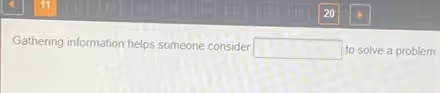 The completed sentence is: “Gathering information helps someone consider options to solve a problem.”