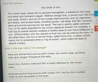 The other options are incorrect because they are incomplete. The first option, “Plant and animal food sources both contain iron, which helps red blood cells carry oxygen throughout the body,” is a true statement from the text but only serves as background information. It misses the core comparison that is the focus of the passage. The second option, “Heme iron, found in meat and fish, is easily absorbed by the human body,” is also true but is too specific. It only represents one half of the comparison, completely ignoring the significant information provided about nonheme iron from plants. The correct main idea must encompass both sides of the argument to reflect the full scope of the text.