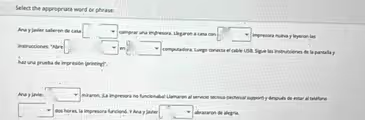 This exercise requires selecting the appropriate Spanish words to complete a short narrative about two people, Ana and Javier, setting up a new printer. Each choice depends on understanding Spanish grammar, including prepositions, articles, and pronouns, within the context of the story.