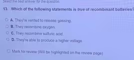 - A. They’re vented to release gassing. This is false. Recombinant batteries are sealed to prevent gassing and enable the recombination process. They do have safety valves that can release excess pressure if the battery is severely overcharged, but they are not vented for normal operation like a flooded battery.