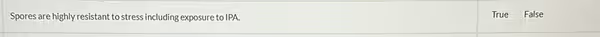 The statement that spores are highly resistant to stress, including exposure to Isopropyl Alcohol (IPA), is correct.ilization procedures such as autoclaving, which uses high pressure steam at elevated temperatures, or the application of potent sporicidal chemicals like This resistance is a fundamental concept in microbiology and a critical consideration in sterilization and disinfection protocols.