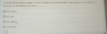 Second, the question specifically asks to check the “voltage.” Voltage is the measure of electrical potential difference, or the “pressure” that pushes the electrical current through a circuit. It is measured in volts (V). Amperage, or “amps” (A), measures the current itself, which is the rate of flow of electric charge. The question is not about measuring the flow, but the electrical pressure. Therefore, any option involving “amps” is incorrect. This eliminates the “DC amps” option.