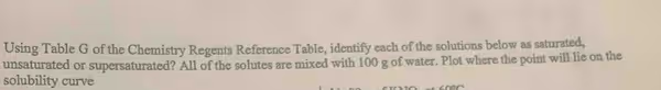 To solve this problem, one must use Table G, the Solubility Curves chart, from the Chemistry Regents Reference Table. This chart plots the solubility of various substances (in grams of solute per 100 grams of water) against temperature (in degrees Celsius). The state of a solution, whether it is saturated, unsaturated, or supersaturated, is determined by comparing the given amount of dissolved solute at a specific temperature to the solubility curve of that particular substance.