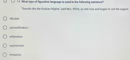 In the sentence, “Sounds like the Arabian Nights,” the speaker, Mrs. White, is making a direct reference to a well-known work of literature. “The Arabian Nights,” also known as “One Thousand and One Nights,” is a famous collection of Middle Eastern folk tales filled with stories of magic, fantasy, and extraordinary adventures. By alluding to this specific work, the character conveys that the situation or story she is hearing is so fantastical, exotic, or unbelievable that it seems to belong in a fairytale. The author uses this reference as a shortcut to create a specific mood or to characterize the events being discussed without needing to use extensive description. The reader’s familiarity with “The Arabian Nights” allows them to immediately understand the intended comparison.
