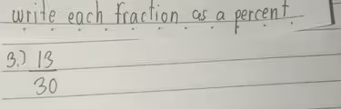 The goal of this problem is to convert the fraction 13/30 into a percentage. The word “percent” literally means “per one hundred,” so converting a fraction to a percent is a way of finding its equivalent value out of 100. There are two common methods to achieve this.