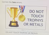 The second error is the use of the word “metals.” While a medal is typically made of metal, the word “metal” refers to the raw material or element, such as gold, silver, or bronze. The image, however, clearly displays a specific type of award: a medal, which is a decorated piece of metal often hung from a ribbon and given to commemorate an achievement. In the context of an awards display alongside a trophy, the sign is not warning people away from raw materials but from the specific award objects. Therefore, the correct word is the plural form of medal, which is “medals.” Using “metals” is confusing and imprecise, whereas “medals” accurately identifies the second type of award shown in the picture. Correcting these two words ensures the sign is both grammatically accurate and contextually clear.