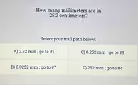 The other options are incorrect because they represent common conversion mistakes. Options A and C result from incorrectly dividing by 10 or 100, which would be the operation used when converting from a smaller unit to a larger one (like millimeters to centimeters). Option B involves an incorrect conversion factor altogether. Therefore, 25.2 centimeters is equal to 252 millimeters.